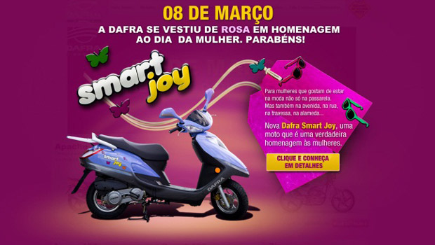 Em homenagem ao Dia Internacional da Mulher (08/03) o site da Dafra trará predominância cor rosa, um banner destacando o lançamento do Smart Joy, scooter criado para as mulheres e uma mensagem parabenizando as mulheres. “Pensamos em promover essa ação, pois o público feminino conquista a cada dia mais espaço no segmento de duas rodas”, explica Carolina Menescal, gerente de marketing da DAFRA Motos.