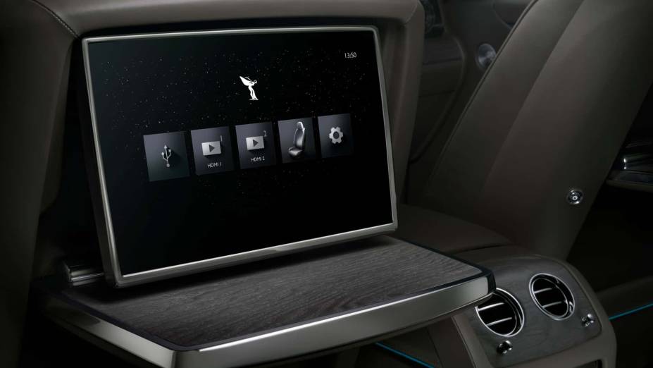Todo o painel é feito de vidro e com uma grande tela que ocupa toda a sua extensão. Claro que o tradicional relógio da Rolls-Royce marca presença e junto dele há uma nova estatueta do “Spirit od Ecstasy”.