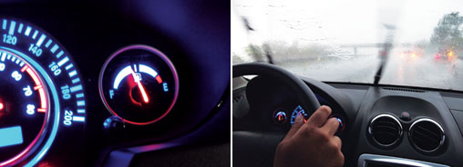 Encantado, o marcador do combustível para na metade do caminho mesmo com o tanque cheio(esq.) | As palhetas flat blade sofreram para dar conta de um temporal numa viagem até Limeira (SP) (dir.)