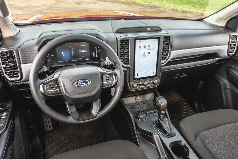Quem vê o quadro de instrumentos digital de 8 polegadas ou a central multimídia vertical de 10 polegadas não imagina que nas XLT e Limited essas telas teriam 12 polegadas e menos moldura. Mesma coisa para a faixa horizontal do painel que combina plástico texturizado e um plástico cinza brilhante, que dão lugar à combinação de plástico macio e prateado nas versões mais caras.