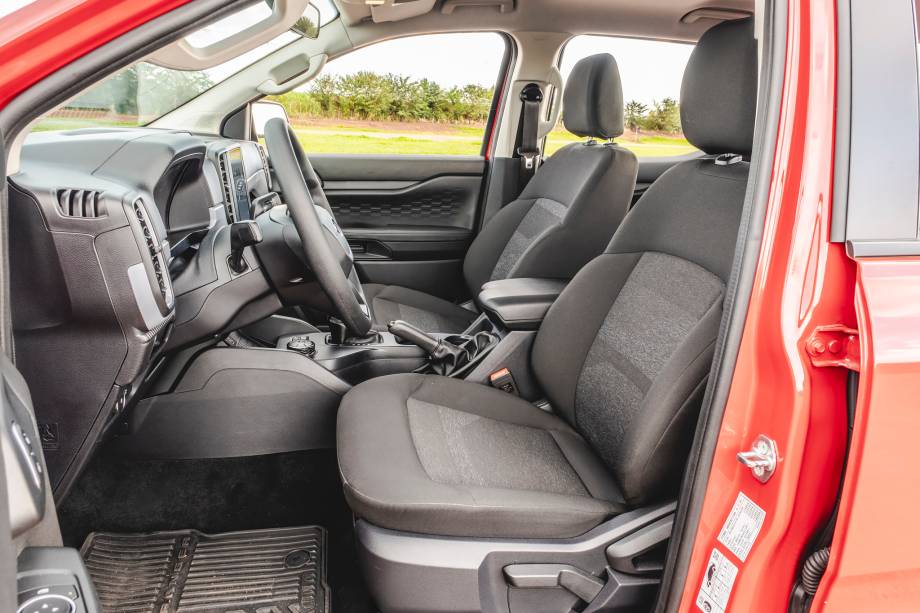 Na verdade, falta sim. Bancos de couro (ou de material que o imite) são uma exigência comum entre os usuários de picape por facilitar a limpeza, mas a forração poderia chegar ao apoio de braços central, que é de plástico. Mas, em se tratando de uma picape média, o resultado está de bom tamanho.
