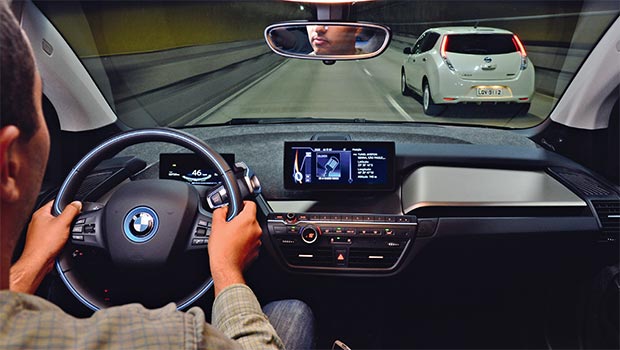 Materiais nobres como alumínio (no painel) e fibra de carbono (nas soleiras de porta) dão requinte à cabine do i3. Seu sistema de regeneração de energia durante as frenagens é muito mais perceptível: você tira o pé do acelerador e a desaceleração é brusca. A reposição de carga é eficiente, mas exige atenção extra do piloto durante o período de adaptação. No Leaf, o sistema funciona de modo semelhante, mas com menor força de frenagem. O i3 tem ainda um pequeno motor a combustão que não participa da tração. Está lá apenas para carregar as baterias.