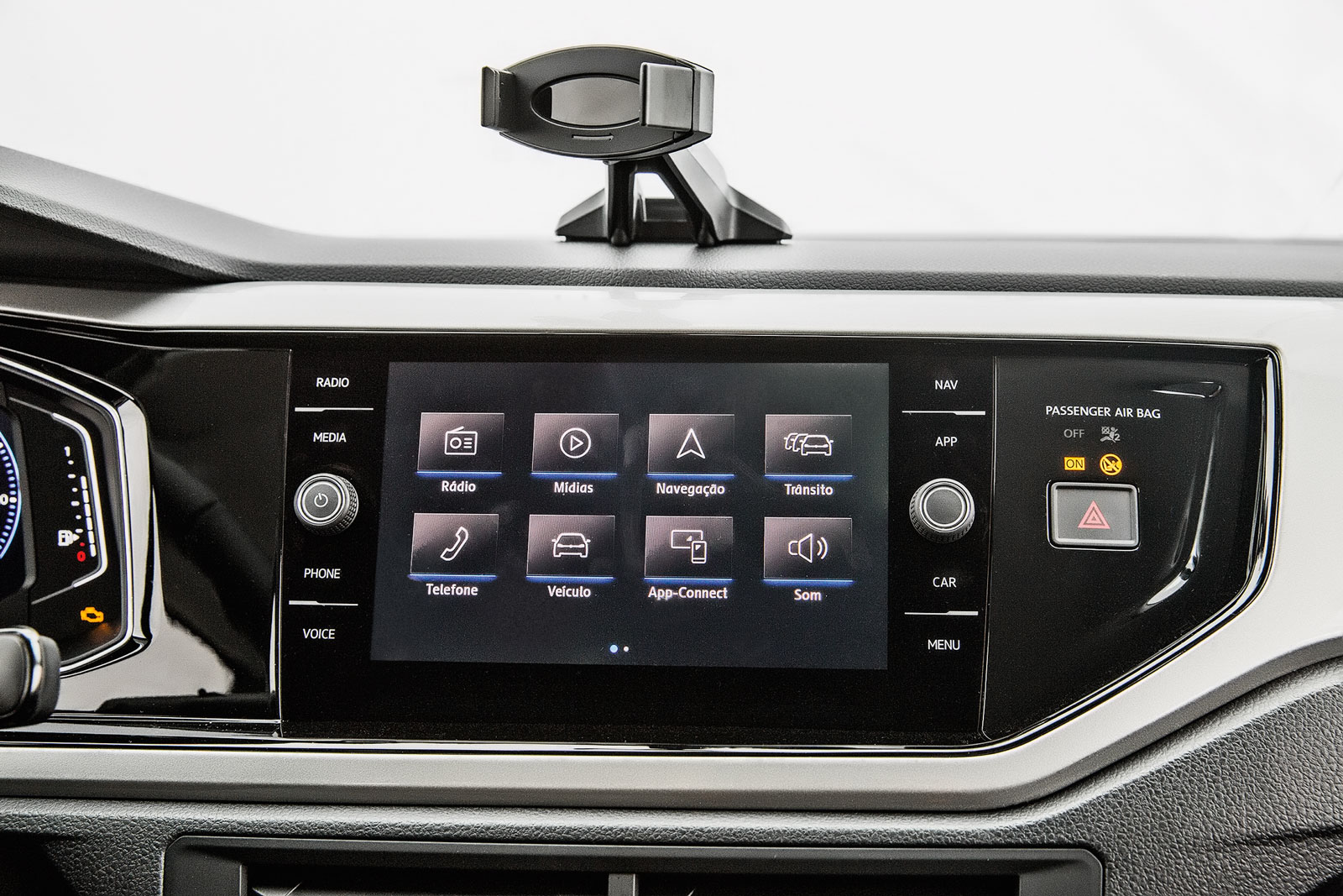 Além disso, as duas entradas permitem integração com o sistema multimídia via Android Auto e Apple CarPlay. No Virtus, apenas a porta USB do console permite tal facilidade, uma vez que a que fica no topo do painel, junto ao suporte original de celular, serve apenas como fonte de alimentação de energia.