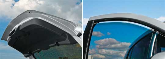 Ao rodar sobre pisos irregulares, batentes do porta-malas começam a apresentar rangidos (esq.); O fechamentod as portas é facilitado com a abertura automática de uma fresta na janela (dir.).
