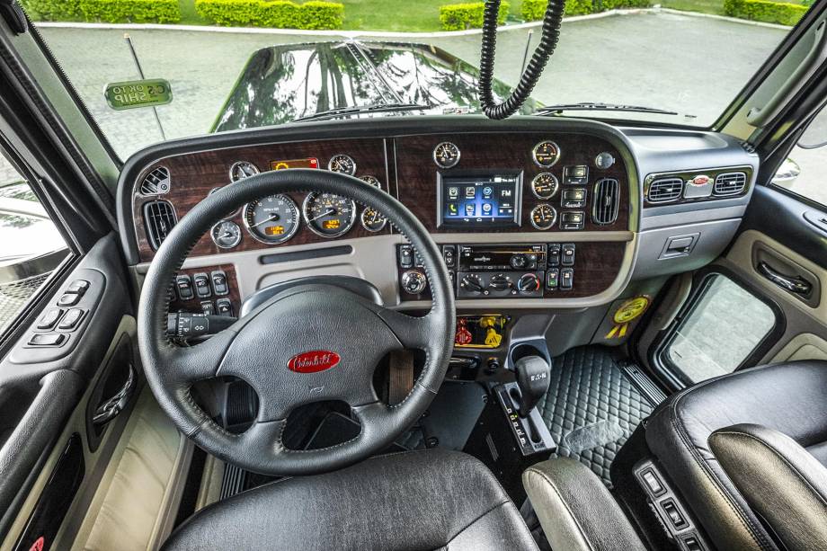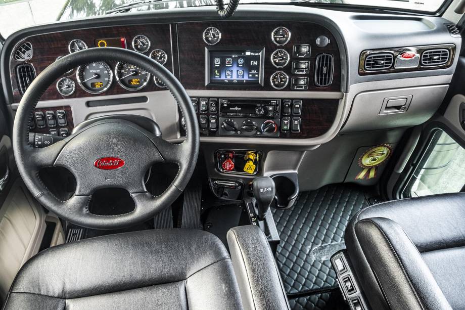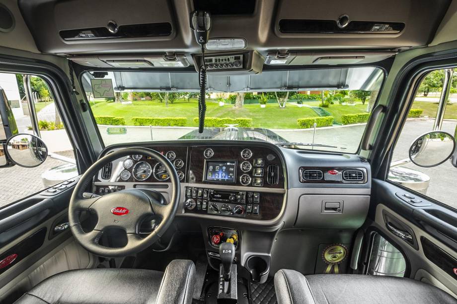 Todos os 10 Peterbilt desta série estão com praticamente todos os opcionais disponíveis. O painel é emborrachado e tem apliques imitando madeira, os bancos dianteiros são pneumáticos e o câmbio é um automatizado Eaton com 18 marchas, sendo duas overdrive.
