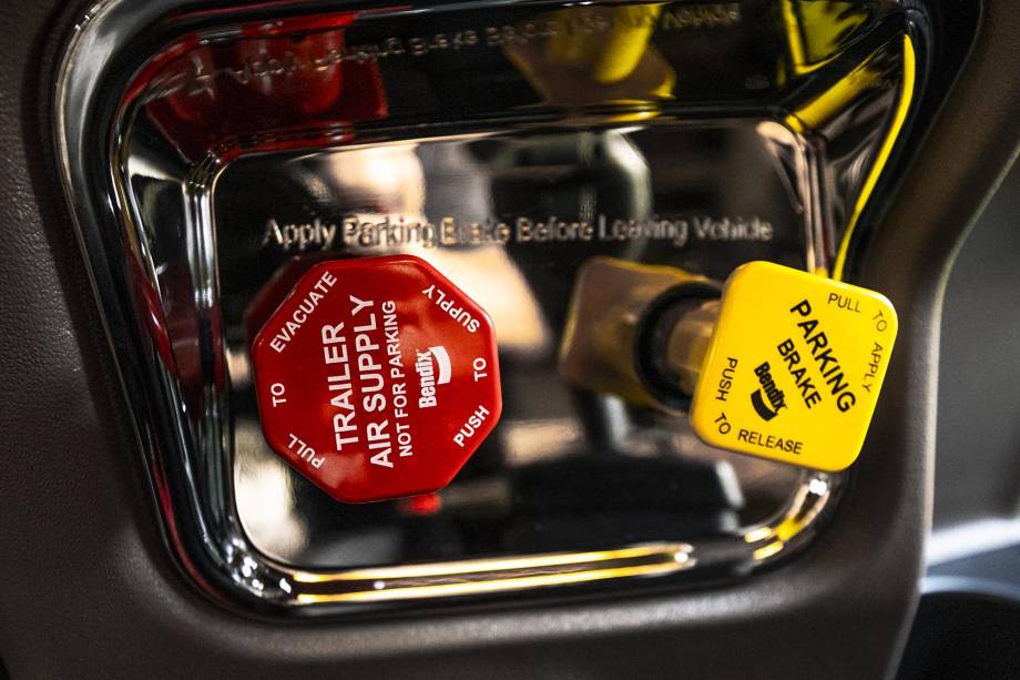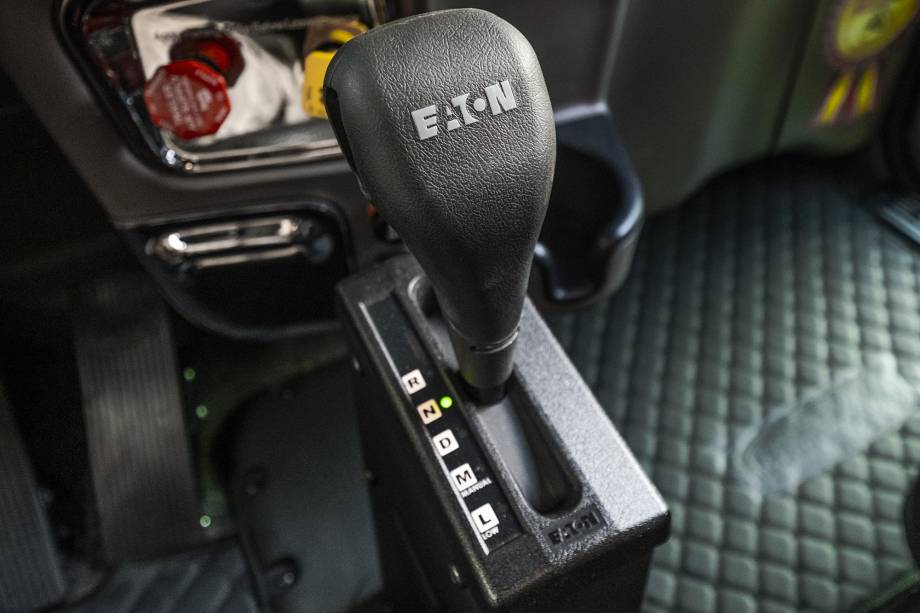 O barulho do motor não hesita em invadir a cabine e ouve-se nitidamente o ar sendo sugado atraves dos filtros a cada aceleração. O culpado é um motor Cummins X15, um seis cilindros de 15 litros moderno que no Brasil é usado apenas para aplicações navais, como rebocadores. Pesa 1.450 kg e nesta unidade, sem limitadores de rotação, entrega 630 cv e colossais 283,2 kgfm. Não por acaso, usa freios a disco acionado pelo sistema pneumático.