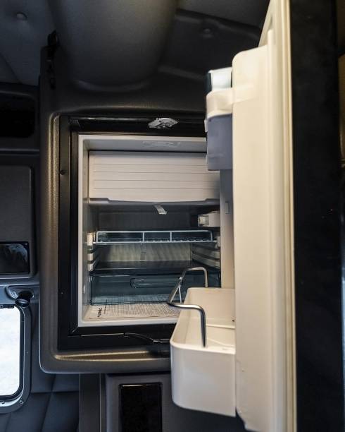 Atrás está a maior cabine sleeper disponível, praticamente um quarto de 4 m² com mais de 2 m de pé direito, uma janela de cada lado, saídas de ar-condicionado dedicadas, geladeira, smart TV, guardarroupas e uma cama de casal.