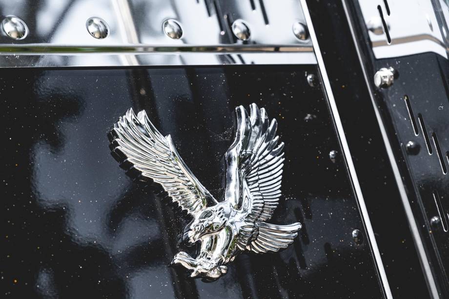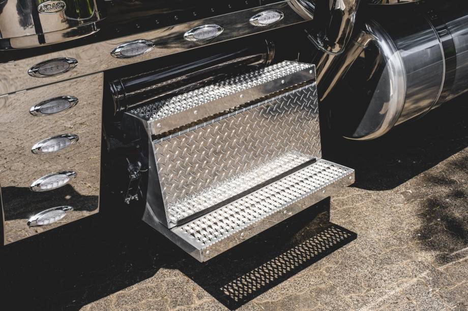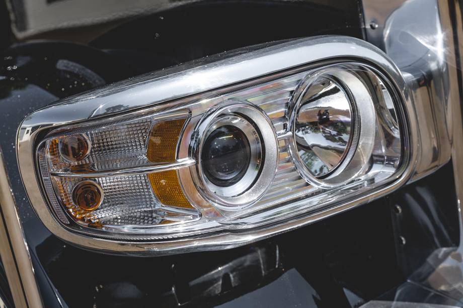 Para-choque, grade, filtros de ar, retrovisores, parassol, polainas, buzinas, os clássicos dutos de escape verticais e até os faróis destacados, presos à grade como há décadas, são de inox ou cromados por tradição.