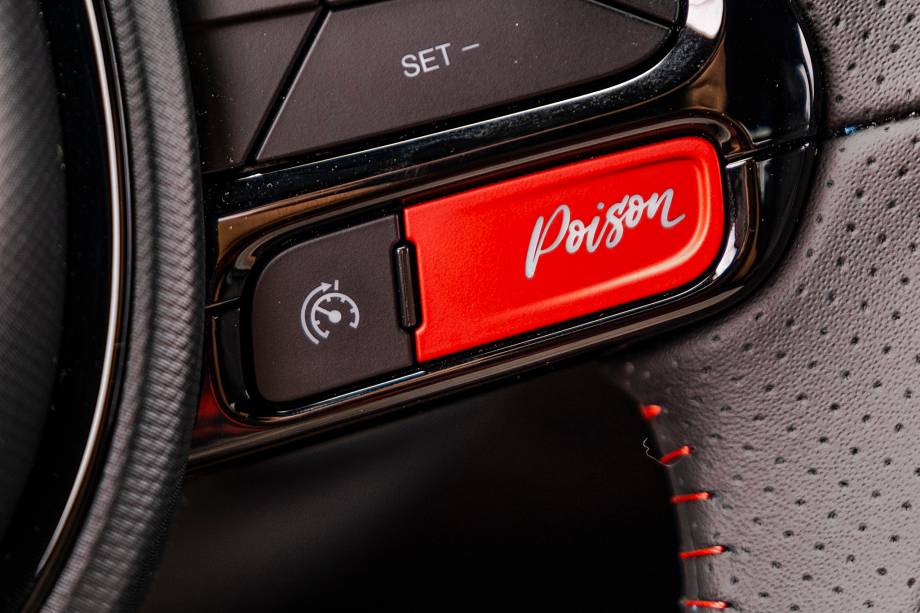 A magia acontece quando se aperta o botão vermelho no volante, onde está escrito “Poison” (veneno). Pode soar cafona, mas é ele que envenena o motor com linhas de programação que interferem em quase tudo do carro. É muito mais que o modo “Sport” dos outros Fiat, de fato.