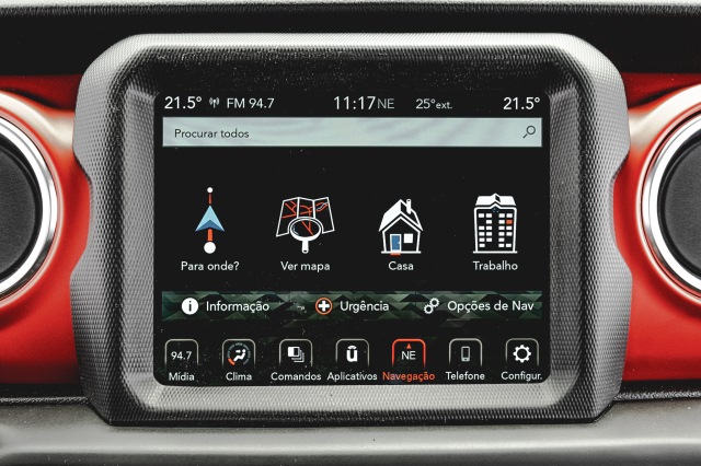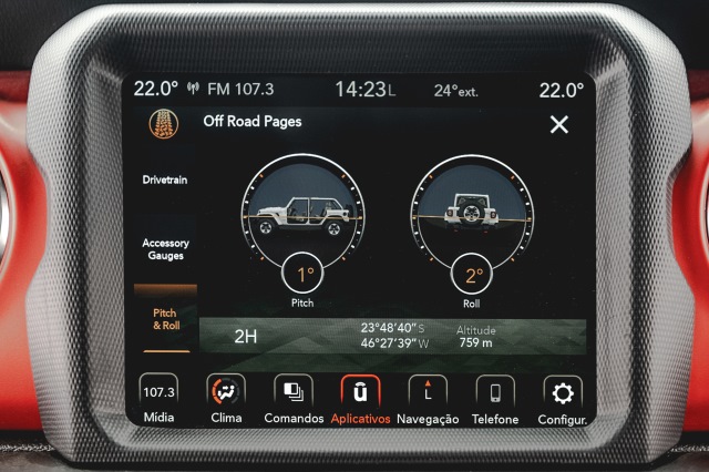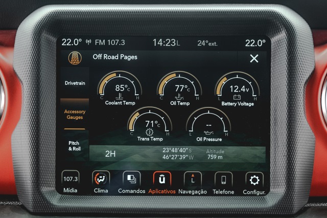 Os faróis são full-led e a central multimídia com tela touch de 8,4”, o GPS é compatível com os sistemas Apple CarPlay e Android Auto, tem um aplicativo Off-Road Pages, que informa coisas como altitude, inclinação lateral e longitudinal da carroceria e o tipo de tração em uso.