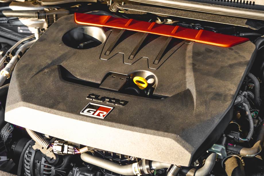 O motor três cilindros 1.6 é uma versão ainda mais potente daquele usado pelo Toyota GR Yaris, este sim um carro de homologação para o mundial de rali (WRC), que já nasceu com toda a parte traseira do chassi do Corolla. Agora com 44 cv extras, este motor chega aos 304 cv e 37,7 kgfm de torque. Como? Com turbo, intercooler e injeção direta e indireta, que funcionam juntas quando se exige o máximo do motor. Não houve perda de potência no Brasil, mas ele precisa de gasolina de alta octanagem.