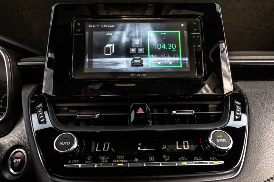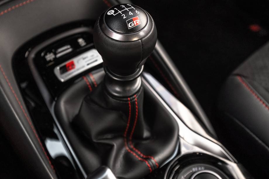 Você até pode experimentar reações mais rápidas no modo Sport ou um GR Corolla mais dócil no modo Eco, mas esses modos não interferem em muita coisa. Esses modos não interferem nos amortecedores, que não são ajustáveis, ou a resposta da direção. Por sinal, o aro fino do volante também ajuda a trazer a sensação de ser um esportivo à moda antiga.