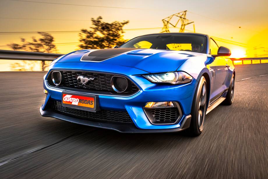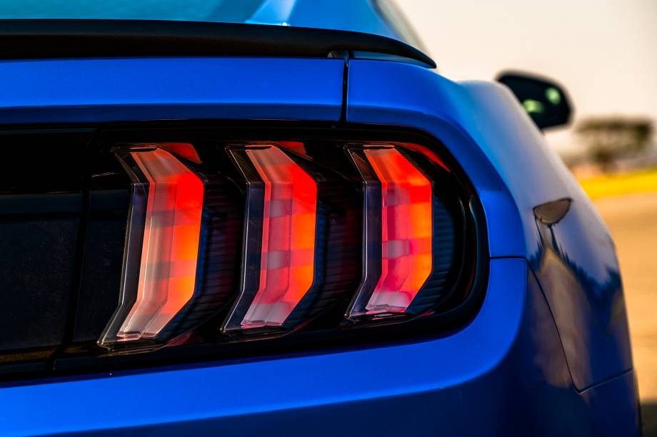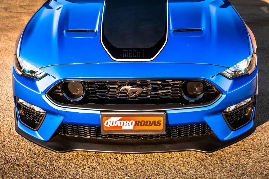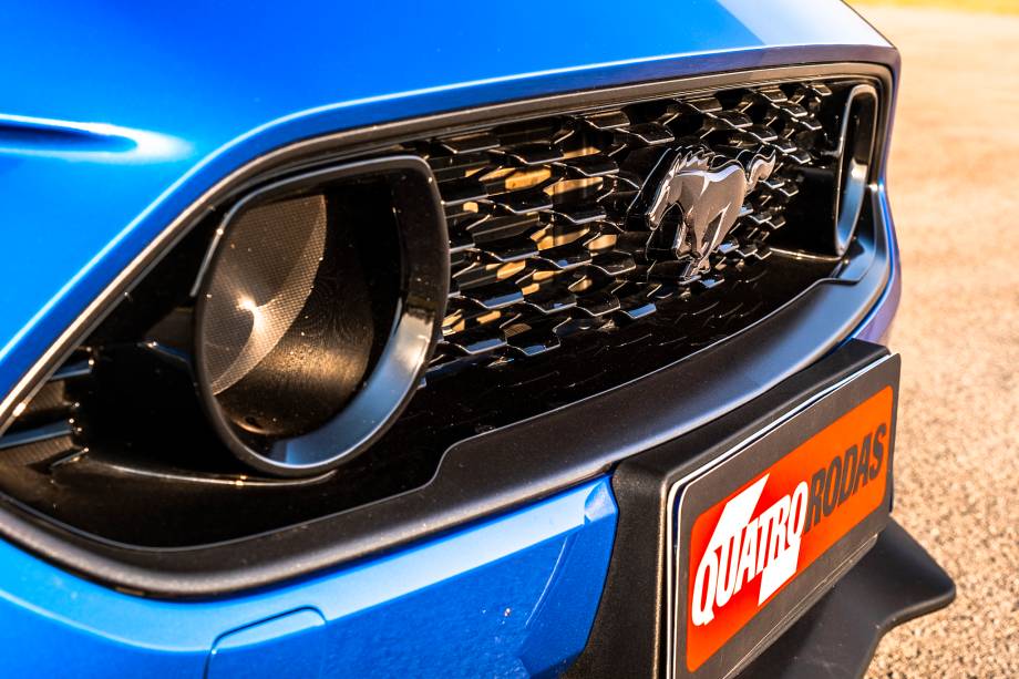 Além da mecânica, o visual do modelo reúne diversos elementos clássicos ou emprestados de outros Mustang. Na dianteira, ele ganha uma faixa preta central com a borda em tom contrastante, que pode ser laranja, vermelho ou branco, de acordo com a cor da carroceria. No caso da carroceria azul, como a unidade testada, o detalhe é branco.
