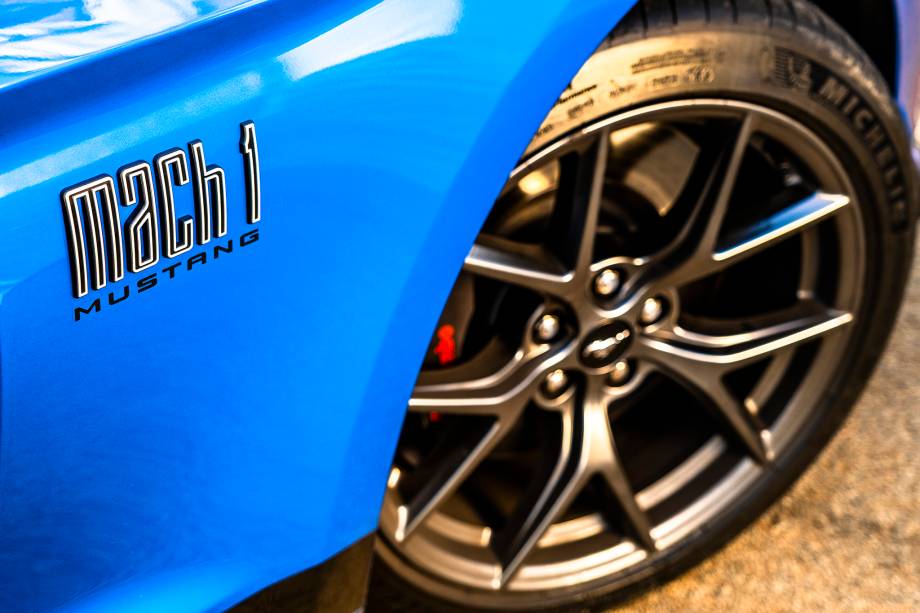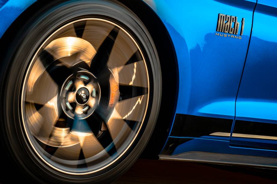 A inscrição Mach 1 na ponta da faixa central lembra que este não é qualquer Mustang e mantém a mesma tipografia do modelo de 1969. O grande destaque, porém, fica na grade do cupê. Ela adota apliques circulares que remetem aos faróis auxiliares também da primeira geração da série.